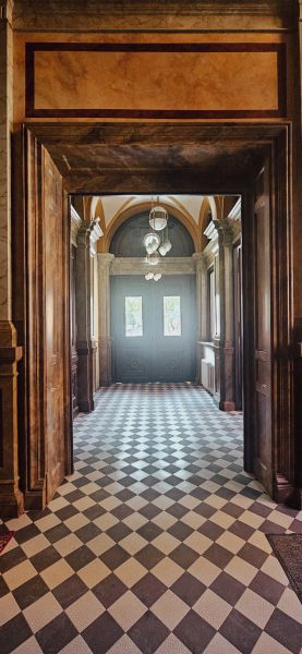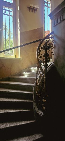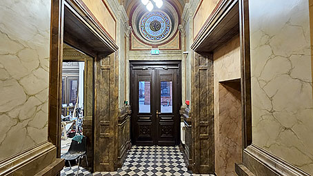 • 2023- 2025 r. konserwacja i renowacja wnętrza budynku – stolarka, portale, boazerie i parapety, stropy, sztukaterie, spoczniki, polichromie ścienne, odtworzenie mazerowania i marmoryzacji